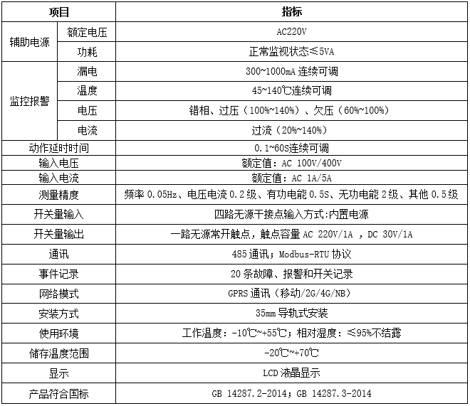 產(chǎn)品簡(jiǎn)介:智慧用電在線監(jiān)控裝置是針對(duì)0.4kV以下的TT、TN系統(tǒng)設(shè)計(jì)的智能電力裝置,具有單、三相交流電測(cè)量、四象限電能計(jì)量、諧波分析、遙信輸入、遙信輸出功能,以及RS485通訊或GPRS無線通訊功能,通過對(duì)配電回路的剩余電流、導(dǎo)線溫度等火災(zāi)危險(xiǎn)參數(shù)實(shí)施監(jiān)控和管理。