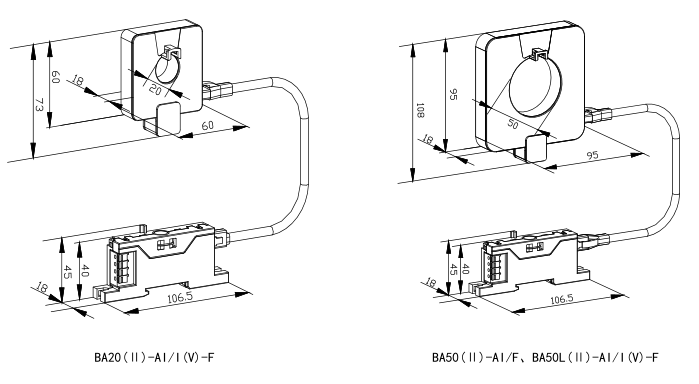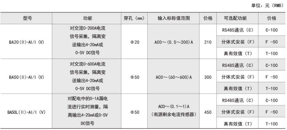 智能型BA系列電流傳感器應用電磁感應原理,對電網中的交流電流進行實時測量,采用恒流和線性補償技術,將其隔離變換為標準的直流信號輸出,或通過RS485 接口(Modbus-RTU 協議)將測量數據進行傳輸。DC24V 或12V 安全電壓供電,可廣泛用 于工業自動化領域。BA50L(Ⅱ)-AI 為交流剩余電流互感器,主要檢測用電系統的漏電流,能隨時掌握電氣線路和設備的情況,防止因漏電而發生的火災等事故。