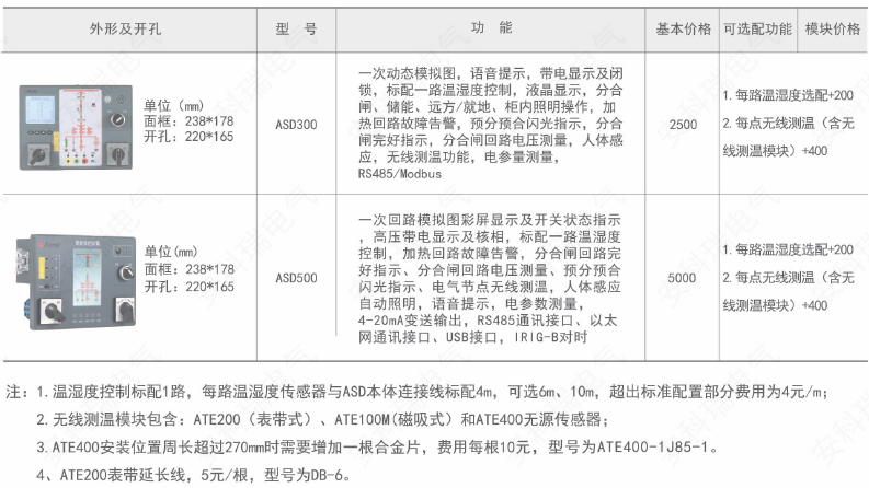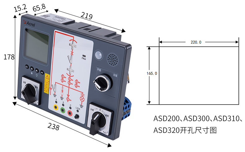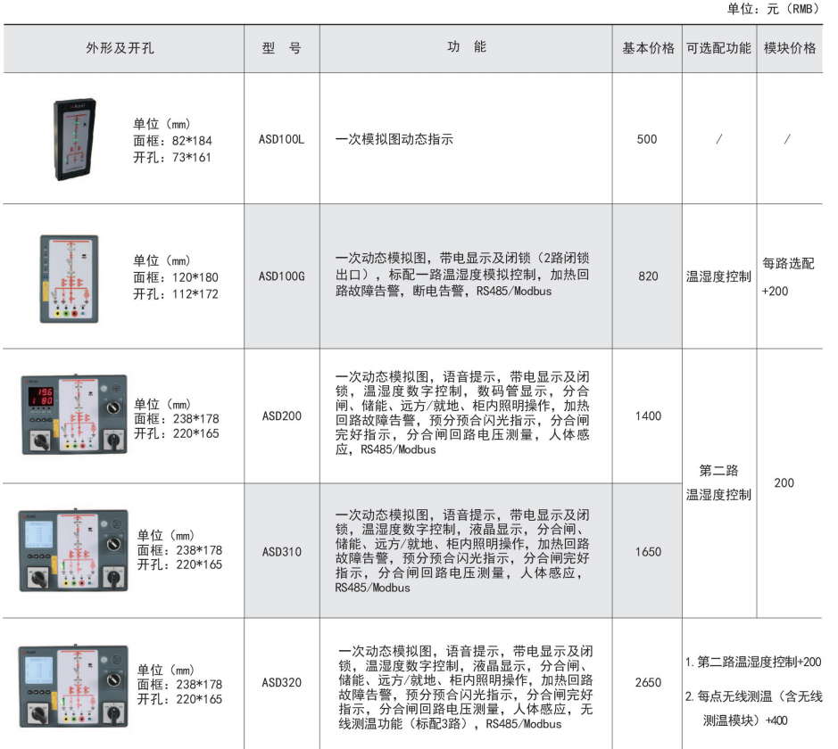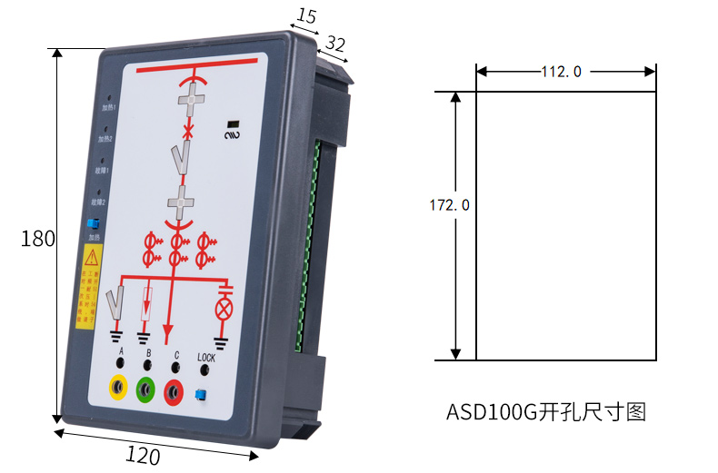 ASD系列開關(guān)柜綜合測控裝置具有一次回路模擬圖及開關(guān)狀態(tài)指示、高壓帶電顯示、自動溫濕度控制、人體感應(yīng)自動照明、語音提示、電參數(shù)測量及RS485通訊接口等功能,集操作、顯示于一體,直觀地體現(xiàn)柜內(nèi)元件的工作狀態(tài)及工作環(huán)境。
