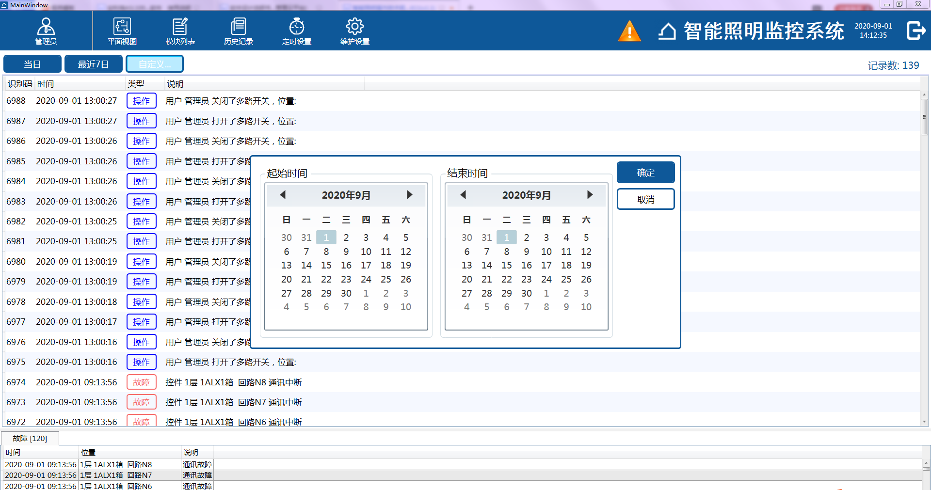 2)當發生模塊離線、網關設備掉線或者狀態反饋和下發控制命令不一致時會發生故障報警,并將故障報警信息記錄并顯示在界面中。