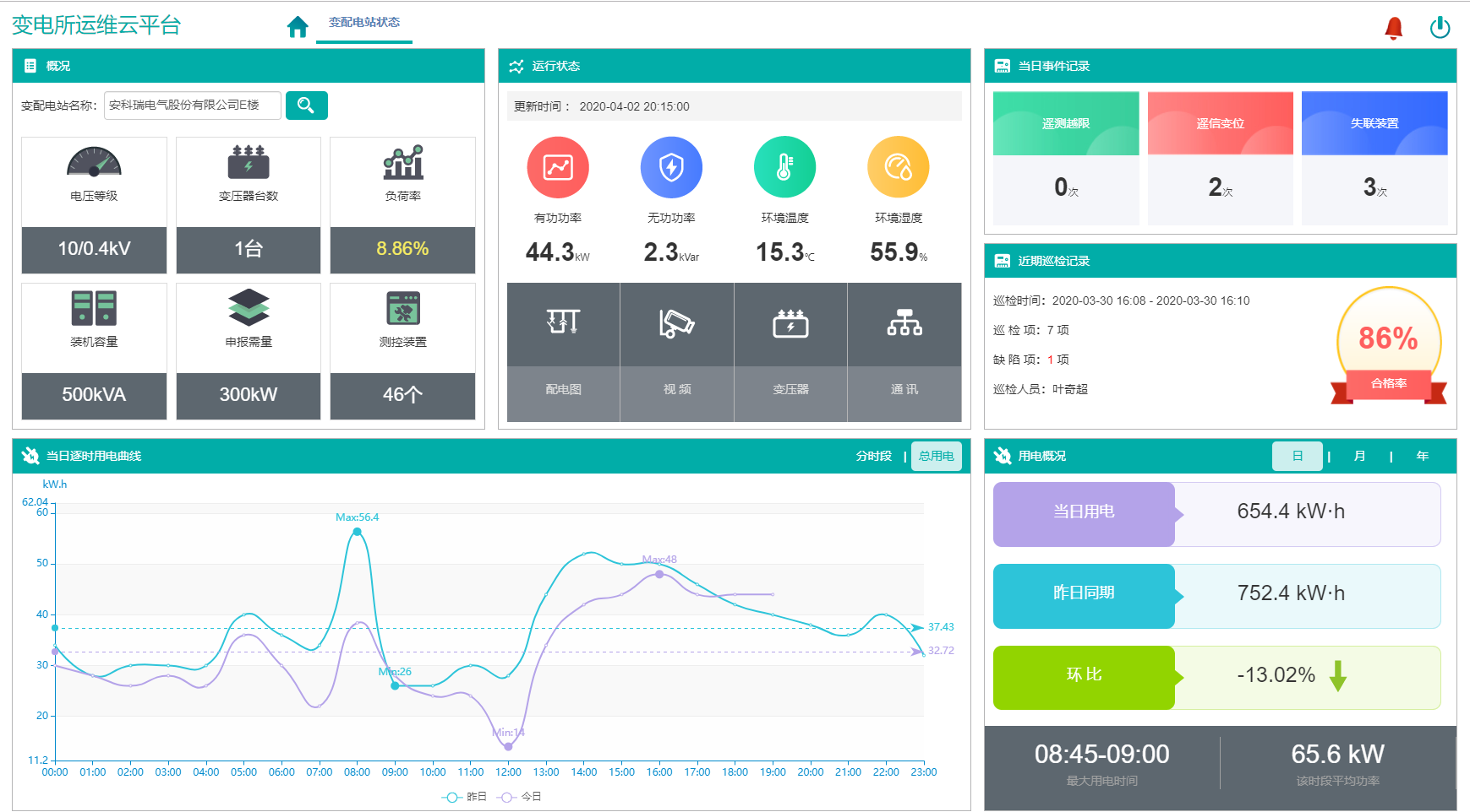支持大屏展示用戶運維變電所概況、環境監測、實時電壓、實時負荷、實時電量、配電圖等。