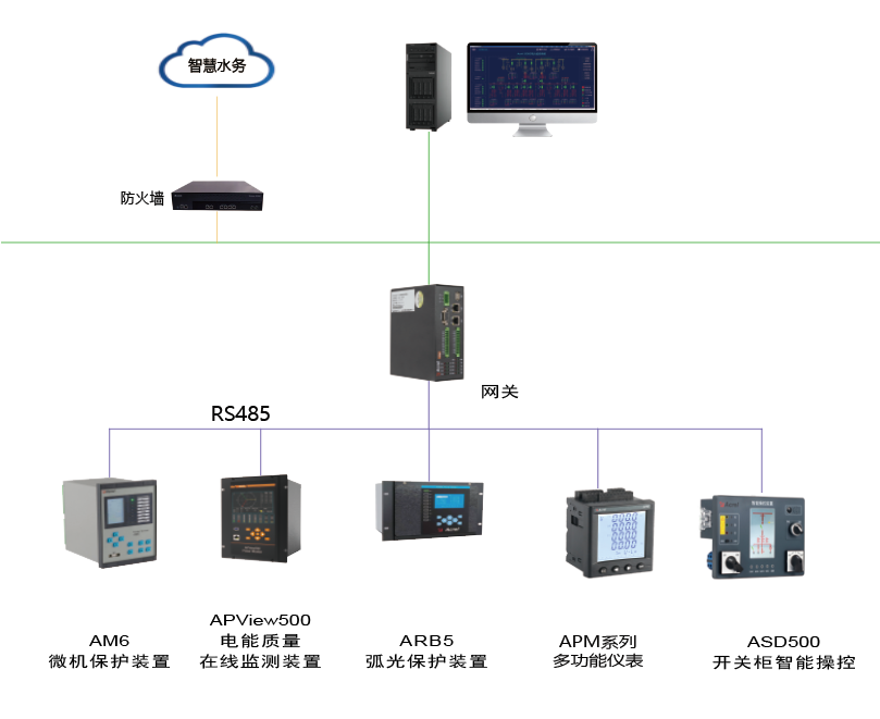 電力監控系統主要針對水務廠區變電站、開閉所和10/0.4kV配電房,對電源進線配置電能質量監測裝置實時監測進線電能質量,包括電壓閃變、跌落、電壓合格率等數據生成電能質量分析報告。高壓回路配置微機保護裝置進行保護和監控,對配電房0.4kV出線配置多功能計量儀表,用于測控出線回路電氣參數和用能情況。同時對變電站(所)內重要設備如柴油發電機、無功補償裝置、有源濾波裝置、狀態進行監測。