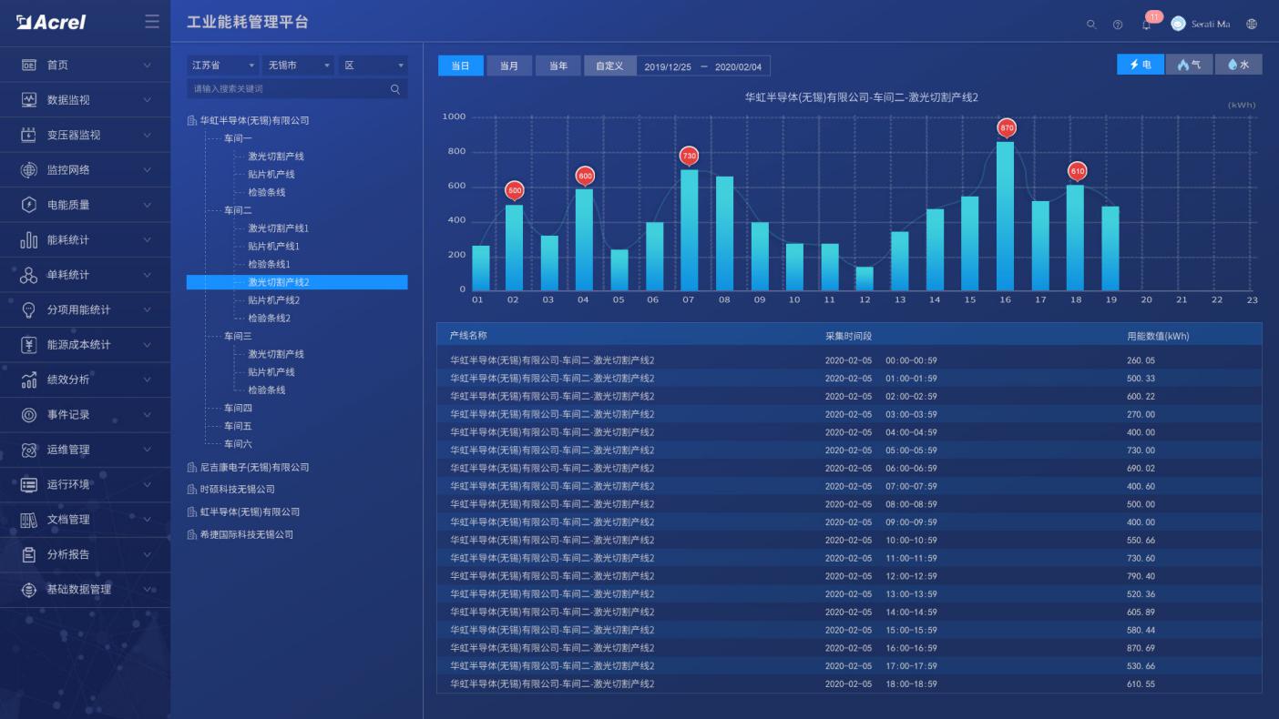 系統對區域、工段、設備能源消耗進行數據采集,監測重點設備及工藝運行狀態,如溫度、濕度、流量、壓力、速度等,并支持變配電系統一次運行監視。可直接從動態監測平面圖快速瀏覽到所管理的能耗數據,支持按能源種類、車間、工段、時間等維度查詢相關能源用量。