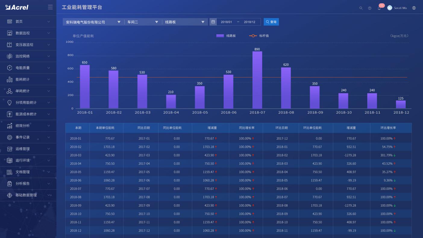 與企業MES系統對接,通過產品產量以及系統采集的能耗數據,在產品單耗中生成產品單耗趨勢圖,并進行同比和環比分析。同時將產品單耗與行業/國家/國際先進指標對標,以便企業能夠根據產品單耗情況來調整生產工藝,從而降低能耗。