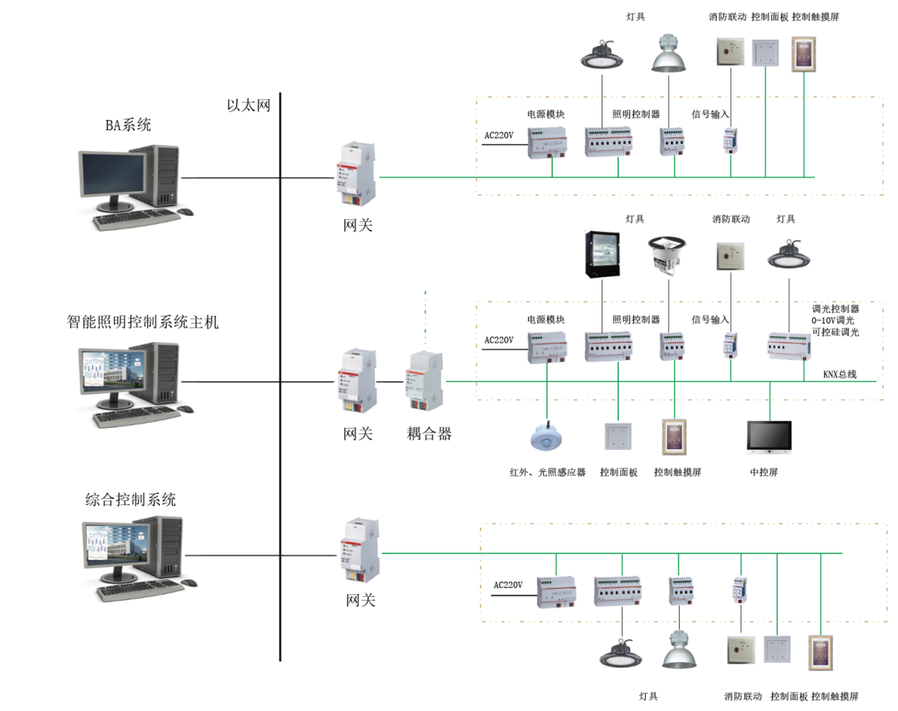 安裝在控制現場的模塊主要有光照度傳感器、紅外傳感器和智能面板。有人經過可以設定紅外感應控制亮燈,人離開后在設定的時間內熄燈,智能面板等手動控制設備,可實現自動控制、現場控制和值班室遠程控制相結合。