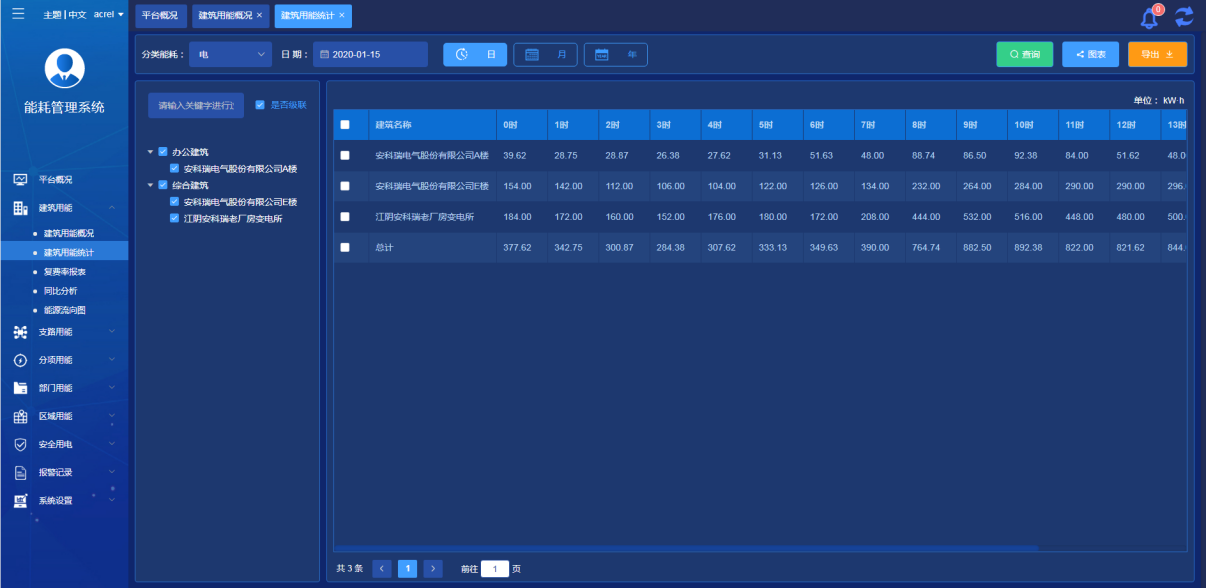 統計當前賬號下所有建筑日、月、年用能統計報表,可選擇以報表或者圖表方式顯示,可導出excel表格形式保存。