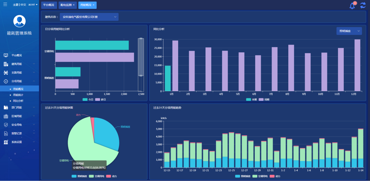 展示當前建筑的照明插座、空調、動力和特殊用電,通過餅圖、柱狀圖顯示能源占比、同比對比以及分項用能趨勢。
