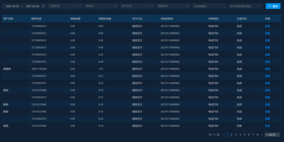 運營趨勢可以按日/月/季度/年查詢期間內充電金額、充電度數、充電次數的浮動曲線和數據。