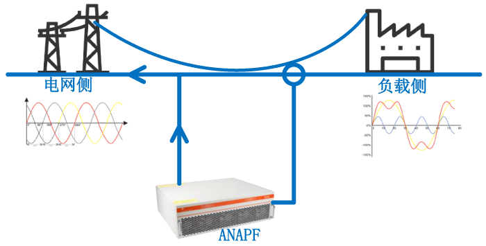 ANAPF系列有源電力濾波器通過CT采集系統(tǒng)諧波電流,經(jīng)控制器快速計算并提取各次諧波電流的含量,產(chǎn)生諧波電流指令,通過功率執(zhí)行器件產(chǎn)生與諧波電流幅值相等方向相反的補償電流,并注入電力系統(tǒng)中,從而抵消非線性負載所產(chǎn)生的諧波電流。